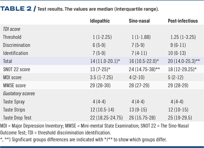 Self-reported anosmia was significantly more frequent among idiopathic OD patients than among patients with post-infectious smell loss (χ2 = 4.710, p = 0.0300), which is linked to the finding that patients with post-infectious smell loss had significantly better TDI scores (p < 0.0001, Kruskal-Wallis) than patients in both the idiopathic OD and the sino-nasal OD group (Table 2).