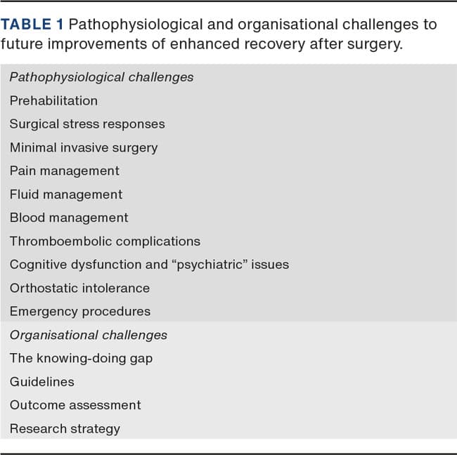 Enhanced recovery after surgery was developed based on the question “Why is the patient in hospital?” and is evolving in the context of multimodal perioperative care programmes with documented major benefits with respect to the need for hospitalisation and the risk of complications. Despite being a worldwide success, future challenges to improvements include patient and procedure-specific modification of inflammatory/immunological stress responses, improvement of post-discharge recovery, closing the knowing-doing gap between scientific evidence and clinical practice, and improving research design strategies.