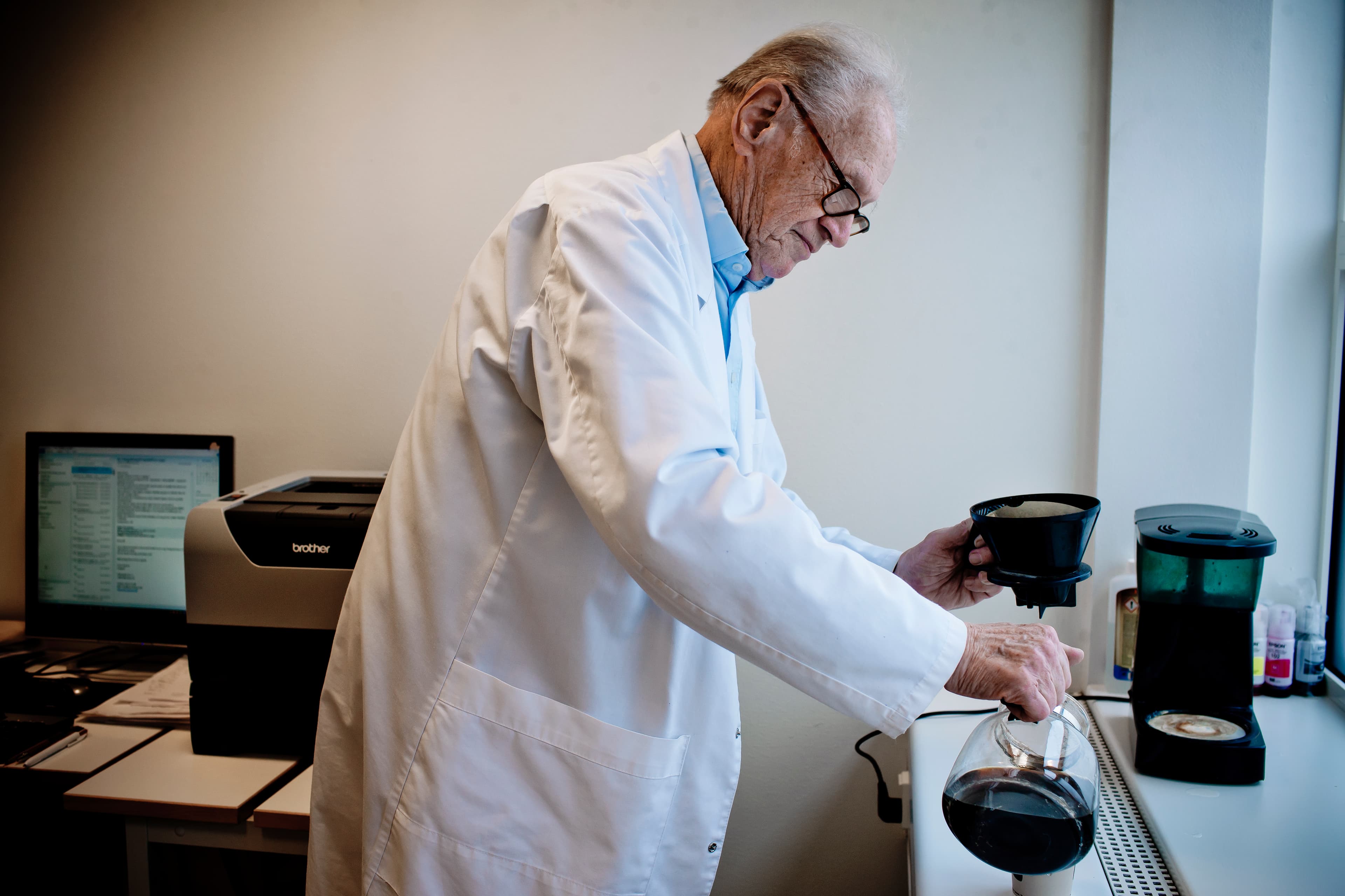 I vindueskarmen i Alf Wennevolds konsultation står en kaffemaskine. For han vil gerne selv have kaffe, og han kan jo ikke sidde og drikke kaffe uden også at byde sine patienter.