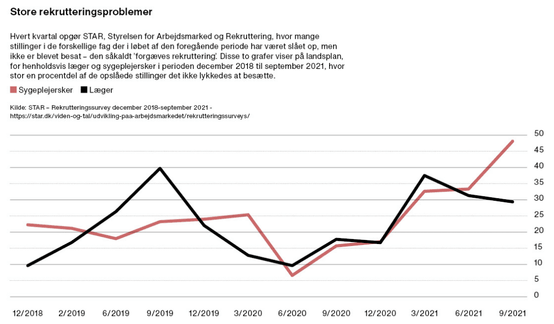 Tallene fra den nyeste opgørelse fra STAR, der kom i starten af denne måned, viser, at tallet for forgæves rekruttering for lægernes vedkommende ligger på 29 procent, mens det for sygeplejersker er på hele 47 procent. I den tilsvarende opgørelse fra september 2020 var tallet for sygeplejersker 16 procent – der er altså tale om en tredobling af tallet på et år.