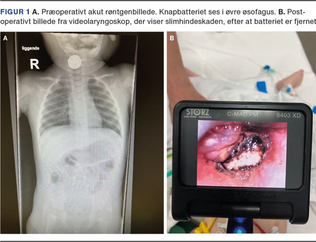 En 10 mdr. gammel pige kom med forældrene i modtagelsen, hvor pater forklarede, at pigen måske havde indtaget et knapbatteri. Pigen var relativt upåvirket ved ankomst, men hostede og savlede en del. Umiddelbart efter ankomsten blev der taget et røntgenbillede, der bekræftede diagnosen knapbatteri i øvre øsofagus (Figur 1A). Der blev booket tid til akut øsofagoskopi i generel anæstesi og foretaget præoperativ fiberskopi, der viste moderate ødemer omkring aryaregionen, men ingen tegn på obstruktion ved indgangen til larynx.