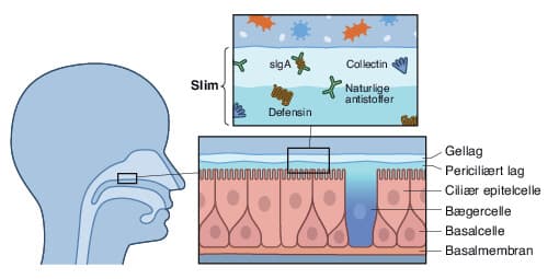 Næsens slimhinde bombarderes konstant med indtrængende fremmede substanser og udgør dermed den første forsvarslinje mod infektion. Slimhinden fungerer først og fremmest som en fysisk barriere, der beskytter det underliggende væv mod patogene mikroorganismer, allergener og luftbårne irritanter (Figur 3). Slimhinden er opbygget af tæt forbundne cilierede epitelceller, bægerceller og basale epitelceller samt en basalmembran. Overfladen er dækket af slim, der er produceret af de cilierede celler og bægercellerne. Slim består af et mukøst og et periciliært lag, og de to lag indeholder en betydelig mængde antimikrobielle faktorer. Tilsammen udgør dette det mukociliære apparat, der er en af de primære mekanismer til eliminering af patogener og partikler fra de øvre luftveje. Hver epitelcelle har et par hundrede cilier, som bevæger sig synkront, hvilket resulterer i transport af slim fra næsen mod svælget, hvor det synkes eller ekspektoreres. Det er påvist, at den mukociliære clearancetid er signifikant langsommere hos patienter med COVID-19 end hos raske personer [12]. En reduktion af det mukociliære apparats funktion er også beskrevet ved andre luftvejsinfektioner [13].