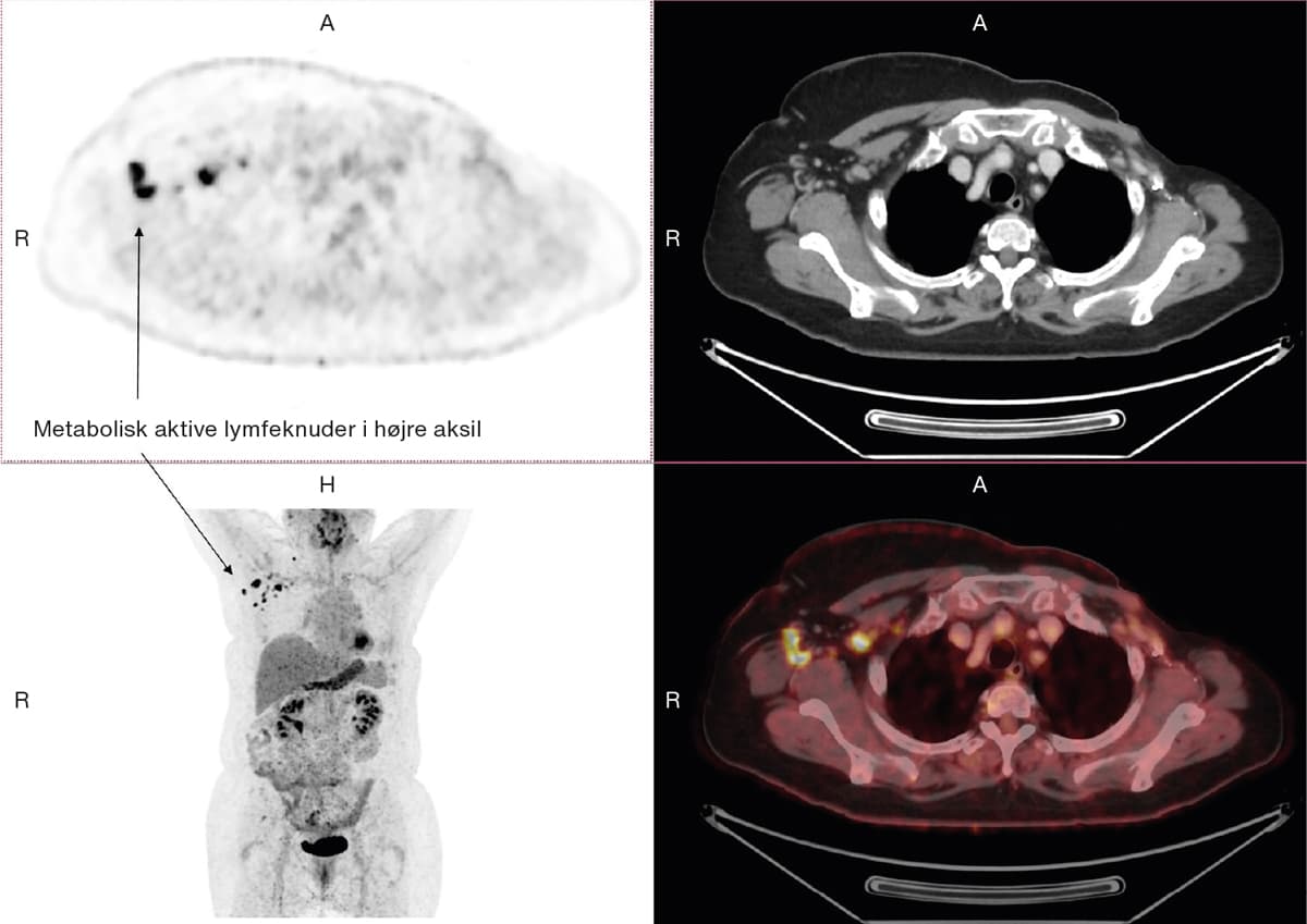 En 65-årig kvinde, der var radikalt mastektomeret for venstresidig mammacancer 20 år tidligere, søgte egen læge pga. ubehag nær venstre brystprotese. Ved en objektiv undersøgelse palperedes der en mulig fortykkelse af venstre costa 10-11. Der var mistanke om metastasering af tidligere cancer, og patienten blev henvist i et kræftpakkeforløb. Som led i udredningen blev der foretaget 18F-fluordeoxyglukose-positronemissionstomografi (FDG-PET)/CT. På skanningen sås flere lymfeknuder i højre aksil og supraklavikulært med kraftigt øget metabolisme, som det kan ses ved malignitet. Lymfeknuderne havde dog reaktivt udseende på CT-billederne med bevaret fedthilus. Der var i øvrigt ingen tegn på recidiv. Patienten var otte dage inden FDG-PET/CT’en blevet COVID-19-vaccineret i højre skulder med en mRNA-vaccine. Fundet blev tolket som lokal immunologisk respons på vaccinationen [1]. Efter udrulning af massevaccination mod COVID-19 er samtidige reaktive metabolisk aktive og forstørrede regionale lymfeknuder en vigtig differentialdiagnose at kende til ved mistanke om malign sygdom.