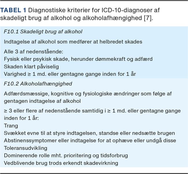 Angst, depression og skadeligt brug/afhængighed af alkohol er hyppigt forekommende lidelser, både hver for sig og samtidig til stede hos samme person. Symptomer som uro, rastløshed, tristhed, nedsat energi, manglende lyst m.fl. kan ses ved alle tre lidelser. I denne artikel defineres skadeligt brug af alkohol/alkoholafhængig ud fra ICD-10, hhv. diagnoserne F10.1 og F10.2 (Tabel 1). Angst (F41.x) og depression (F32.x og F33.x) er ligeledes defineret ud fra ICD-10 [1]. Ofte vil det være svært at få afklaret, om symptomerne er til stede som led i en angst- eller depressionssygdom eller er en følge af skadeligt brug/afhængighed af alkohol. Modsat kan angst og depression føre til skadeligt brug/afhængighed af alkohol. Kombinationen af skadeligt brug/afhængighed af alkohol og en af de to psykiske sygdomme medfører en dårligere prognose, et øget forbrug af sundhedsvæsenet og en overdødelighed [2].