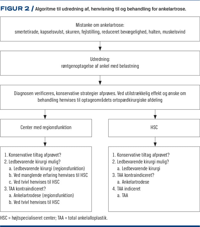 TAA udføres på et af tre højtspecialiserede centre i Danmark. Den primære indikation er ankelartrose i slutstadiet hos patienter uden kontraindikationer. Hos disse patienter medfører protesekirurgi gode resultater med høj patienttilfredshed [20]. De hyppigste postoperative komplikationer er medial malleolfraktur, nerveskade, forsinket eller manglende sårheling samt infektion. På længere sigt ses der komplikationer som cysteudvikling, løshed/havari af protsekomponenter samt impingement og heterotop ossifikation. Komplikationsraten afhænger af kirurgernes erfaring, faktorer hos patienten samt protesetype og opgives typisk til at være 5-15% [20].