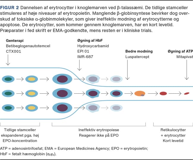 Transfusionskrævende β-talassæmi skyldes nedsat/manglende dannelse af β-globin, som er en essentiel byggesten i voksenhæmoglobin (HbA1 = α2β2). Mangel på β-globin fører til ineffektiv dannelse af erytrocytter i knoglemarven (erytropoiese) og nedsat levetid for de modne erytrocytter. Dette medfører svær anæmi få måneder efter fødslen, hvilket ubehandlet vil føre til død i den tidlige barndom. Hjørnestenen i behandlingen er regelmæssige blodtransfusioner, der erstatter knoglemarvens produktion af erytrocytter og kobles med jernkelering for at hindre den livstruende sekundære hæmokromatose. Et væld af nye medicinske behandlinger (Figur 2) er i kliniske forsøg, og European Medicines Agency (EMA) har for nylig godkendt to nye præparater, luspatercept og betibeglogenautotemcel, til behandling af β-talassæmi.