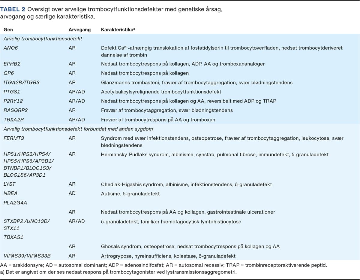 Der er i dag identificeret mere end 60 forskellige gener associeret til arvelige trombocytsygdomme [8]. Nogle af disse gener har funktion i flere væv, og varianter heri kan være forbundet med syndromer, der rækker ud over det hæmostatiske system. De arvelige trombocytsygdomme kan inddeles i arvelige trombocytopenier (Tabel 1) og arvelige trombocytfunktionsdefekter (Tabel 2) med normalt trombocyttal. Begge kan være forbundet med syndromer, og arvelig trombocytopeni kan også være forbundet med andre sygdomme [9]. Blødningsfænotypen er mukokutan og omfatter blødninger fra slimhinder og hud, menoragi samt forlænget blødningstid ved kirurgi og fødsler. Blødningstendensen kan variere fra ingen blødning (isoleret mild trombocytopeni) til svær blødningstendens med livstruende blødningsepisoder [10].