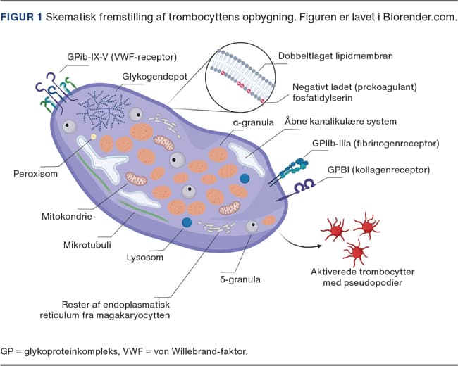 Trombocytten er en yderst kompleks celle (Figur 1), der indgår i talrige fysiologiske funktioner og er afgørende for den hæmostatiske proces [2]. Trombocytter er kerneløse celler, der dannes fra megakaryocytter i knoglemarven ved frigivelse af cytoplasmafragmenter til blodbanen. Her cirkulerer trombocytterne langs med endotelet, så de er optimalt placerede, når der sker en skade på karvæggen. På skadestedet adhærerer de hurtigt til komponenter i den eksponerede ekstracellulære matrix (kollagen og von Willebrand-faktor) via transmembrane glykoproteinreceptorer, hvor de aktiveres og aggregerer til en primær prop.