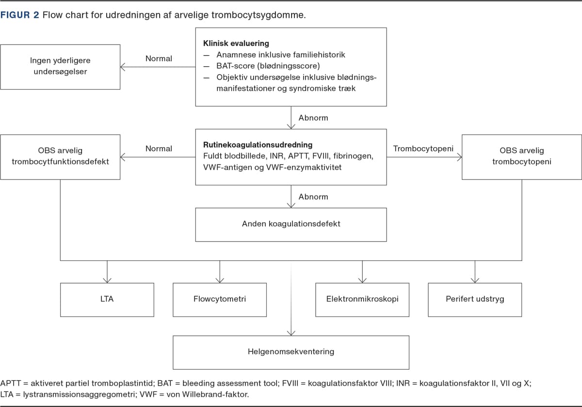 Det første skridt mod en diagnose (Figur 2) er en grundig klinisk evaluering af patienten. Sværhedsgraden af patientens blødningstendens vurderes ved hjælp af bleeding assessment tool (BAT)-score [20]. Patienten spørges grundigt ind til blødningssymptomer fra 14 forskellige lokationer og scores efter blødningsepisodernes alvorlighed og behov for behandling. En signifikant BAT-score er defineret som > 3 for mænd og > 5 for kvinder. Anamnesen bør derudover omfatte indtag af trombocythæmmende medicin og familiehistorik for blødning og hæmatologisk malignitet. Ved den kliniske undersøgelse vurderes blødningsmanifestationer (hæmatomer, petekkier mv.) samt tilstedeværelse af syndromiske præg. Ved fund af enten abnorm BAT-score og/eller klinisk undersøgelse laves en standardkoagulationsudredning.