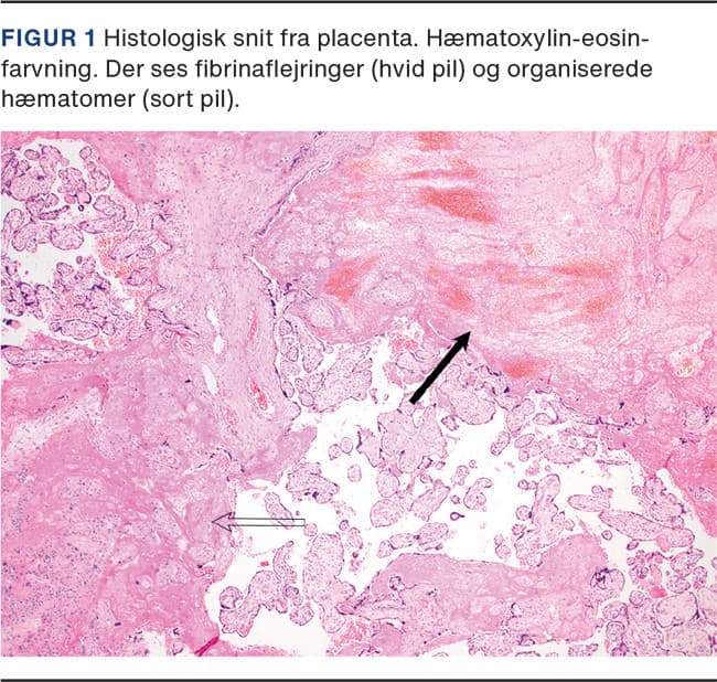 Histologisk undersøgelse af placenta (Figur 1) viste konfluerende organiserede intraplacentære hæmatomer, rigelige fibrinaflejringer, infarcerede villi chorii og organiserede intervilløse tromber af intermediær og ældre dato. Der var hverken akut eller kronisk intervillositis. Ved immunhistokemisk undersøgelse (IHC) kunne man ikke påvise SARS-CoV-2-nukleokapsid.