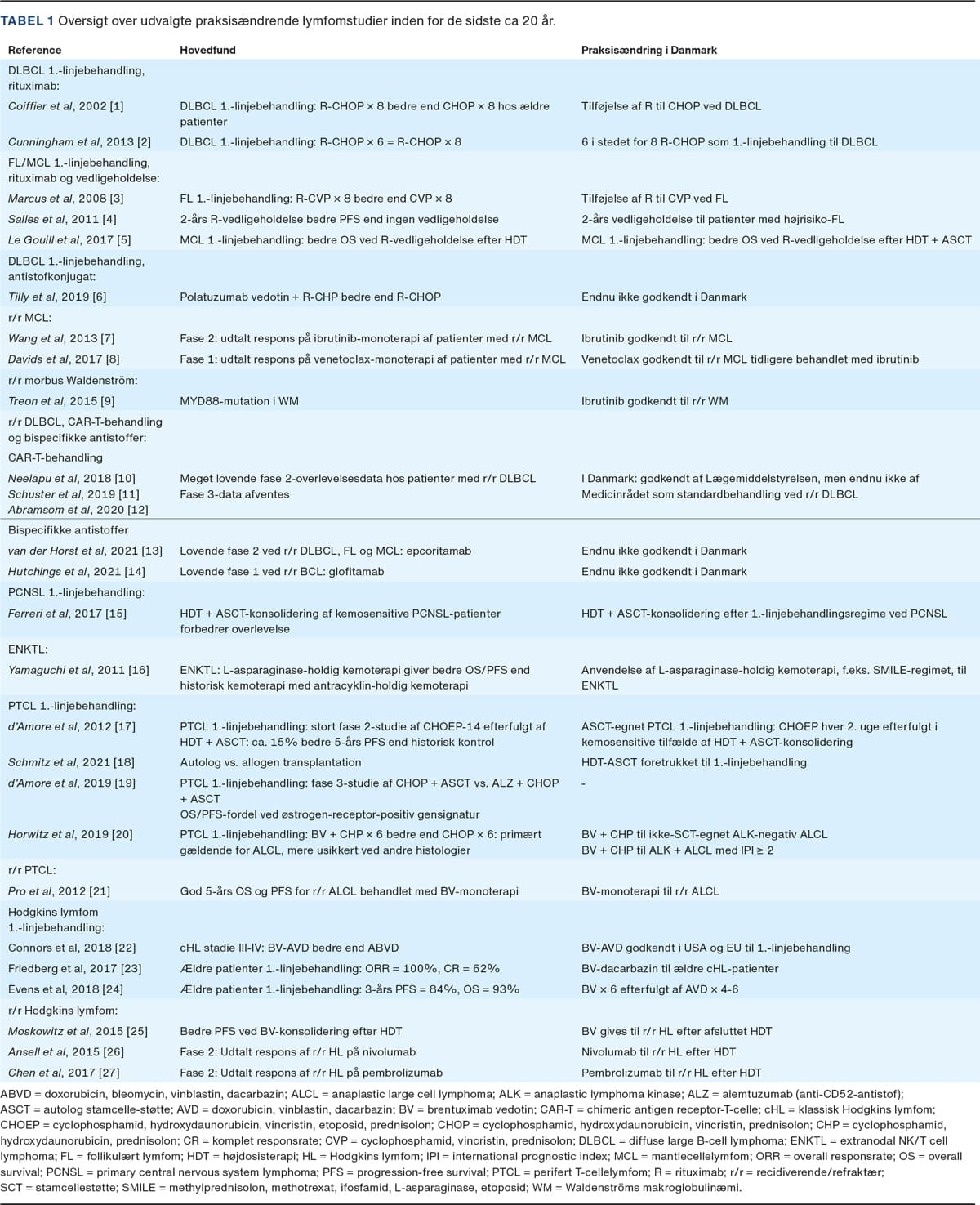 I Tabel 1 vises et udvalg af kliniske interventionsstudier, der inden for de seneste ca. 20 år har været praksisændrende i håndteringen af forskellige lymfomundertyper.