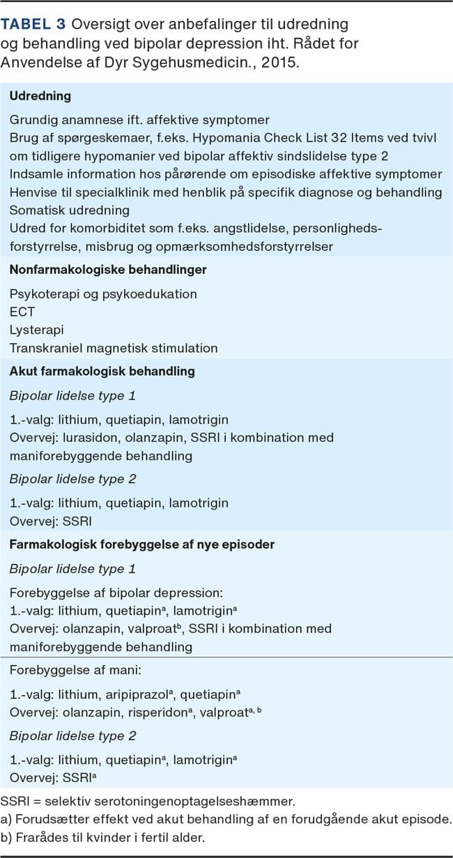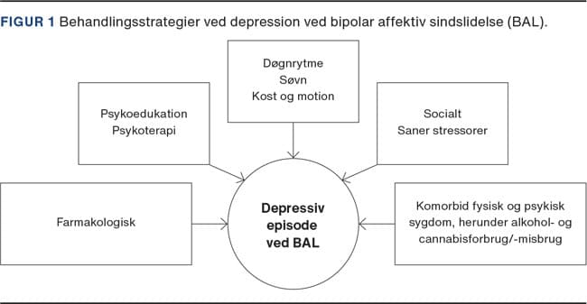 Behandling af BD opdeles i akut behandling og vedligeholdelsesbehandling, som hhv. skal afkorte en aktuel depression og forhindre nye episoder af såvel depressiv som manisk karakter. I Figur 1 ses behandlingsstrategier, som alle kan bidrage til stemningsmæssig stabilitet. Tabel 3 viser anbefalinger fra Rådet for Anvendt Dyr Sygehusmedicin (RADS) fra 2015 [9] vedrørende behandling af BD. Iht. de danske retningslinjer er lithium, quetiapin og lamotrigin førstelinjevalg ved både BD type I og BD type II.