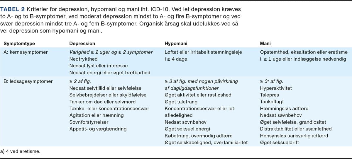 I Tabel 2 ses kriterier for depression, hypomani og mani. Ved tvivlsspørgsmål og afgrænsning over for normale affektive udsving kan der benyttes patientrapporterede spørgeskemaer som f.eks. en hypomanitjekliste [8], som kan hjælpe patienten med at genkalde adfærd og symptomer ved hypomani. Det er afgørende at opfordre patienten til at invitere pårørende til at deltage i undersøgelsen. Til det kliniske billede hører ofte komorbid angstlidelse, obsessiv-kompulsiv lidelse samt alkohol- og stofmisbrug. Hvis egen læge får mistanke om BD, bør patienten henvises til en speciallæge i psykiatri eller til sygehusbaseret psykiatri mhp. udredning og behandling (Tabel 3).