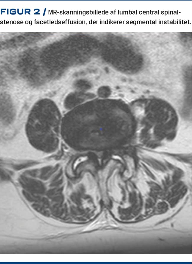 Med MR-skanning kan man som med CT påvise artroseforandringer i facetleddene. Dog undervurderes graden af artrose oftere ved MR-skanning end ved CT, men MR-skanning er bedre til visualisering af forandringer i de omkringliggende strukturer såsom påvirkning af de neurale strukturer, facetledscyster og -ansamlinger samt knogleødem (Figur 2). Baseret på MR-skanning har Fujiwara et al forslået en klassifikation fra grad 1, hvor der er normale forhold, og op til grad 4, hvor der forekommer udtalte osteofytter [19].