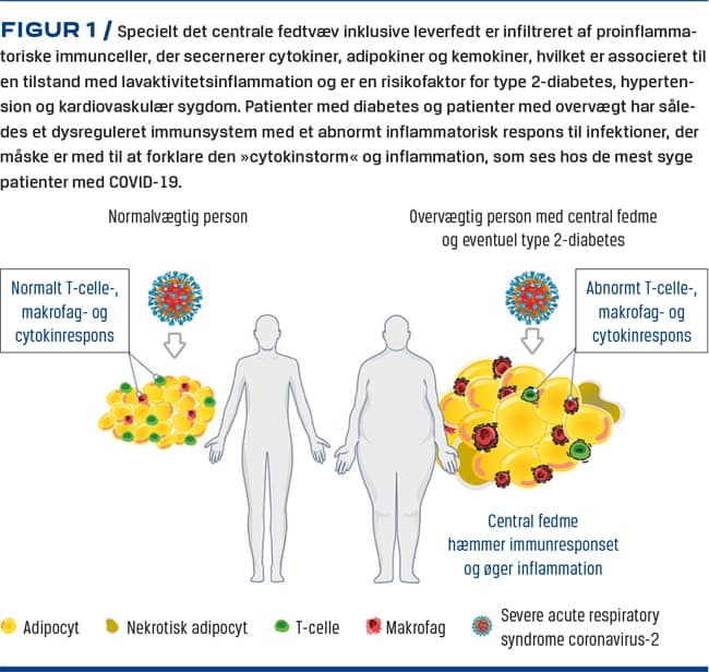 I en landsdækkende dansk undersøgelse med 9.519 patienter med COVID-19 blev 22% indlagt på hospital, 3,2% blev indlagt på en intensivafdeling, og 30-dagesmortaliteten var 5,5%. Høj alder, mandligt køn (54%), hypertension (55%), lungesygdom (22%), iskæmisk hjertesygdom (21%), diabetes (19%) og fedme (12%) var prædiktorer for indlæggelse på hospital, indlæggelse på intensivafdeling og død [3]. I denne artikel diskuteres, hvorfor diabetes og fedme er risikofaktorer for kompliceret COVID-19 samt generelle retningslinjer for behandling af diabetes ved COVID-19. Fokus er på type 2-diabetes.