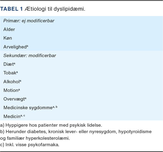 Usund livsstil inklusive fejl- og overernæring, sparsom motion, rygning og overvægt er væsentlige modificerbare årsager til dyslipidæmi hos personer med psykisk lidelse [1]. Dyslipidæmi er desuden associeret med brug af visse psykofarmaka (Tabel 1). Antipsykotika kan inducere overvægt og metaboliske forstyrrelser, hvor sidstnævnte kan optræde uafhængigt af vægtøgning [11]. I en nyligt publiceret netværksmetaanalyse vedrørende sandsynligheden for dysmetabolisme hos patienter med skizofreni i behandling med antipsykotika med en medianbehandlingstid på seks uger fandtes udvikling af dyslipidæmi mest udtalt ved behandling med clozapin (totalkolesterol og triglycerider), olanzapin (totalkolesterol og LDL-kolesterol) samt quetiapin (LDL-kolesterol) [12]. Blandt de stemningsstabiliserende og antidepressive præparater synes en direkte forbindelse med dyslipidæmi ikke at være klart beskrevet, men valproat er associeret med en signifikant sænkning af total- og LDL-kolesterol på trods af øget risiko for vægtøgning, hypertriglyceridæmi og diabetes [13]. Selvom flere psykofarmaka kan lede til overvægt og dysmetabolisme, er eksempelvis antipsykotika paradoksalt nok blevet associeret med reduceret kardiovaskulær dødelighed [14].