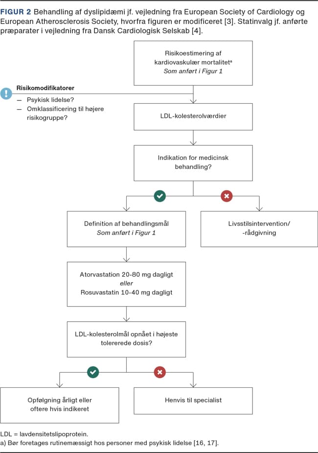 Indikationen for behandling af dyslipidæmi og behandlingsmålet for lipidniveauet baseres på sandsynligheden for kardiovaskulær mortalitet graderet fra lav risiko til meget høj risiko (Figur 1) [4, 15]. Hos danskere uden risikofaktorer for kardiovaskulær mortalitet anbefaler DCS risikoestimering via SCORE-skemaet for lavrisikolande i Europa [4, 15]. SCORE inkluderer alder, køn, rygestatus, systolisk blodtryk samt plasmatotalkolesterolniveauet målt i mmol/l og angiver den absolutte risiko for kardiovaskulær død inden for ti år [4, 15]. Ved SCORE < 5% er der sjældent indikation for medicinsk behandling, mens SCORE ~ 10% indikerer, at medicinsk behandling bør være reglen (Figur 1) [4, 15]. Med traditionelle tabeller som SCORE kan risikoen for kardiovaskulær sygdom og død hos personer med psykisk lidelse dog undervurderes. American Heart Association har vurderet affektive lidelser hos yngre som værende en moderat risikofaktor for udvikling af tidlig aterosklerose samt kardiovaskulær sygdom og tilråder bl.a. tæt metabolisk monitorering hos disse personer [18]. I den seneste internationale vejledning om håndtering af dyslipidæmi hos European Society of Cardiology (ESC) og European Atherosclerosis Society (EAS) fra 2019 anbefales det, at forekomst af psykisk lidelse bør medføre en modificering af den samlede risikovurdering for udvikling af aterosklerotisk kardiovaskulær sygdom (Figur 2) [3]. Det er imidlertid ikke specificeret, hvor meget lavere tærsklen for påbegyndelse af lipidsænkende interventioner hos personer med psykisk lidelse bør være. PRIMROSE er et scoresystem til estimering af kardiovaskulær risiko samt indikation for statinbehandling og inkorporerer forekomst af psykiske lidelse/psykofarmaka, men denne model er endnu ikke valideret i Danmark [19].