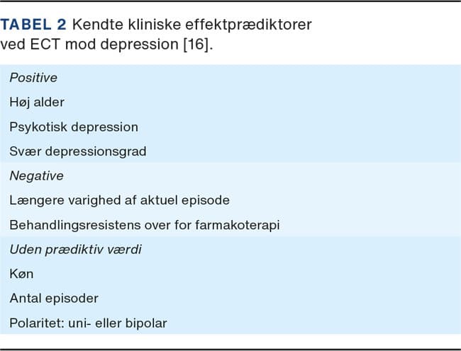 Desuden bør patienter, som ikke har opnået remission ved andre interventioner, eller som har en lang varighed af nuværende episode (f.eks. > 1 år), tilbydes ECT. Disse tilstande er dog associeret med et dårligere ECT-respons [16]. Den kliniske implikation heraf er formentlig, at der i disse tilfælde kræves lidt flere behandlinger, inden effekten indtræder.
