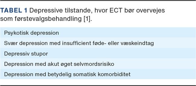 Hovedindikationen for ECT er svær uni- og bipolar depression. Effekten er bedst dokumenteret ved psykotisk depression [16]. Her bør ECT overvejes som førstevalgsbehandling. Andre depressive tilstande, hvor ECT bør overvejes som primærbehandling, er præsenteret i Tabel 1. Patienter med betydelig somatisk komorbiditet er nævnt i tabellen, da denne gruppe ofte er vanskelig at behandle med farmaka, især med tricykliske antidepressiva (TCA) og monoaminoxidasehæmmere.