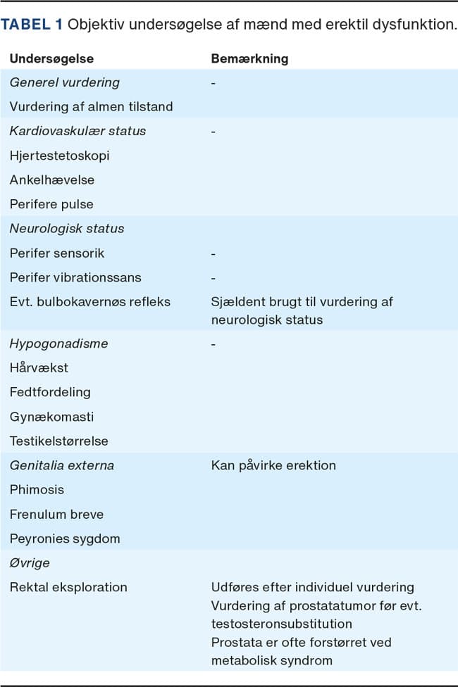Vurdering af patienten med ED kræver en grundig anamnese og objektiv undersøgelse. Anamnesen bør omfatte en grundig beskrivelse af symptomer, debut og udvikling af ED. Her kan man eventuelt inkludere Erection Hardness Scale (Figur 1) eller spørgeskemaer (f.eks. International Index of Erectile Function) [20]. ED kan klassificeres som primært organisk eller primært psykisk betinget, om end der ofte er tale om en blanding. Man bør derfor altid spørge ind til psykosociale forhold og partnerforhold samt sikre, at der ikke er tale om urealistiske forventninger. Hos metabolisk udsatte mænd vil der oftest også være organiske symptomer til stede, hvilket omfatter en gradvis udvikling af ED, der er til stede i alle sammenhænge (f.eks. både sammen med partner og ved masturbation) med udeblivelse af morgenrejsning [21]. Man bør spørge ind til komorbiditeter, medicinliste, misbrug og gennemgå KRAM-faktorerne (kost, rygning, alkohol og motion). Der bør foretages en grundig objektiv undersøgelse (Tabel 1) og en metabolisk screening (Tabel 2). Formålet med en god anamnese og objektiv undersøgelse er at erkende underliggende årsager til ED [22].
