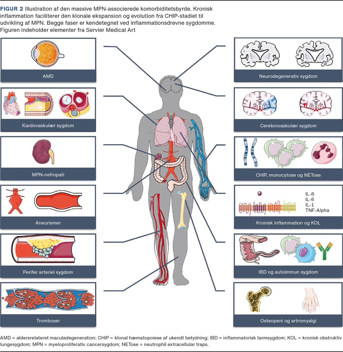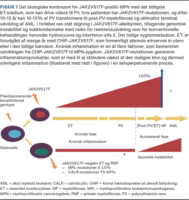De kroniske myeloproliferative cancersygdomme (MPN) – essentiel trombocytose (ET), polycythaemia vera (PV) og primær myelofibrose (PMF) – er erhvervede stamcellesygdomme, som opstår pga. såkaldte driver-mutationer, januskinase 2 (JAK2)V617F, calreticulin(CALR)og myeloproliferative leukæmivirusonkogener(MPL)i den pluripotente stamcelle [1]. Sygdommenes morbiditet og mortalitet er bl.a. knyttet til disse kræftsygdommes komplikationer i form af tromboser og blødninger [1-4]. Kronisk inflammation er en vigtig drivkraft for udviklingen af MPN og sygdommenes progression til det avancerede myelofibrosestadium [5] (Figur 1). Kronisk inflammation er også en væsentlig patogenetisk faktor for mange af de sygdomme, som ledsager MPN [6-13]. MPN-sygdommene er således ikke alene modelsygdomme for sammenhængen mellem kronisk inflammation, vaskulære sygdomme og cancer, men også modelsygdomme for udviklingen af multimorbiditet [6-13] (Figur 2).