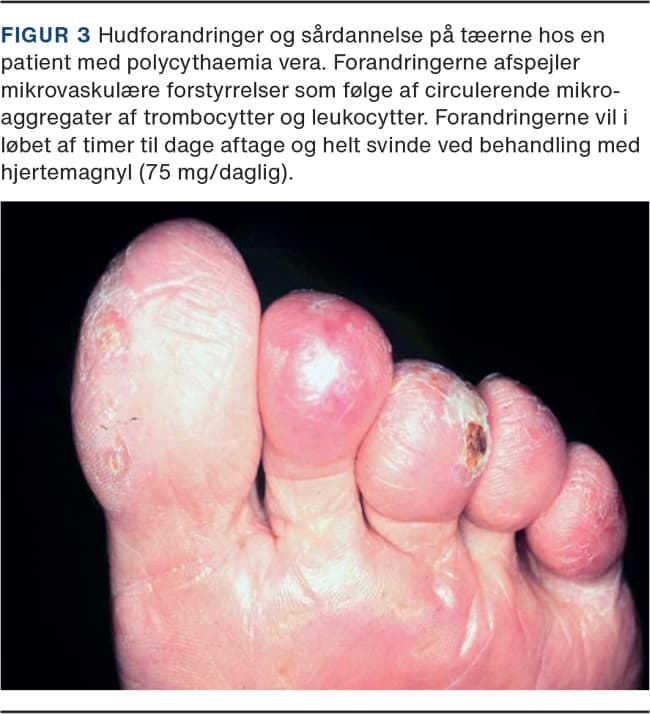 Den øgede risiko for blodpropper er ikke alene kausalt koblet til de forhøjede celletal, men også til kvalitative ændringer i de cirkulerende myeloide celler og i karvægsendotelet, som samlet øger disse cellers aktivitet og evne til at klæbe til hinanden og til karvægsendotelet [4]. NETose dækker over dannelsen af neutrophil extracellular traps (NETs), som er et ekstracellulært trombogent fibernetværk bestående af cellemateriale, herunder DNA- og granulakomponenter frisat fra in vivo-aktiverede neutrofile granulocytter [4]. Ved udtalt trombocytose (1.000-1.500 mia./l, men undertiden også ved lavere trombocyttal) kan der forekomme et erhvervet von Willebrands syndrom og dermed øget blødningsrisiko, som svinder, når trombocyttallet ved cytoreduktiv behandling reduceres til < 1.000 mia./l [4]. På det tidspunkt vil patienten have en øget tromboserisiko, og antiaggregatorisk behandling med hjertemagnyl (75 mg/dag) anbefales. Mikrovaskulære forstyrrelser er hyppige i form af ømme fødder, smertefuld højrødme af huden (erytromelalgia) og sår på fingre og tæer (Figur 3).
