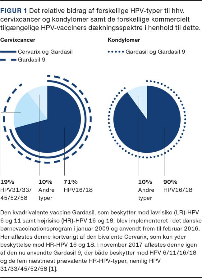 Vaccination mod humant papillomvirus (HPV) blev indført i det danske børnevaccinationsprogram 1. januar 2009 til piger født i 1996 og derefter, primært for at reducere forekomsten af cervixcancer. Tilbuddet var initialt rettet mod piger i alderen 12-15 år, men der har løbende været forskellige opfølgningsprogrammer rettet mod piger og kvinder i alderen 15-26 år. Den anvendte vaccine med tilhørende dækningsspektrum er også udskiftet løbende (Figur 1). Fra november 2017 har Gardasil 9 (9vHPV), der beskytter mod ni HPV-typer, været anvendt [1]. Der findes endnu ikke studier af langtidseffekten af 9vHPV, men RCT’er har vist, at den kvadrivalente vaccine, der beskytter mod fire HPV-typer, yder beskyttelse i op til 14 år [2].