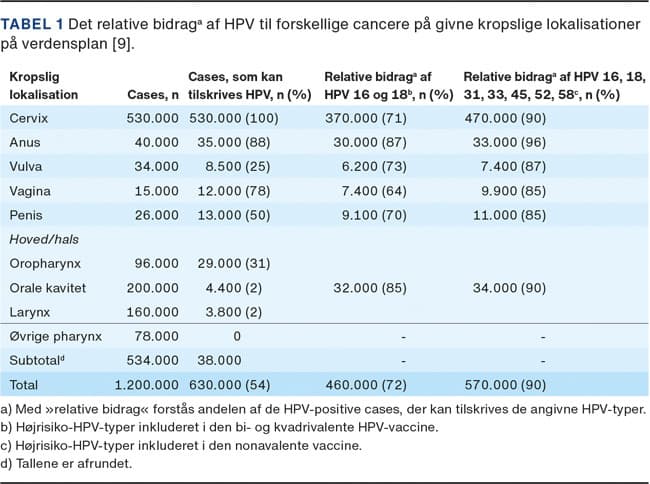 Infektion med HR-HPV er en forudsætning for udvikling af cervixcancer, men HR-HPV kan også forårsage cancer i vulva, vagina, penis, anus og orofarynx (Tabel 1). HPV 16 og HPV 18 er de mest prævalente HR-typer og er tilsammen årsag til ca. 71% af cervixcancere på verdensplan. Næst herefter er de fem mest prævalente HR-HPV-typer HPV 31, 33, 45, 52 og 58, der tilsammen forårsager ca. 19% af alle cervixcancere [1]. HPV-genotypedistributionen er desuden vist at variere i forhold til kvindens alder. I en dansk metaanalyse [10] fandt man en signifikant højere forekomst af HPV 16/18 i cervixcancer hos yngre kvinder (74,8% hos 30-39-årige) end hos ældre (56,8% hos > 70-årige).