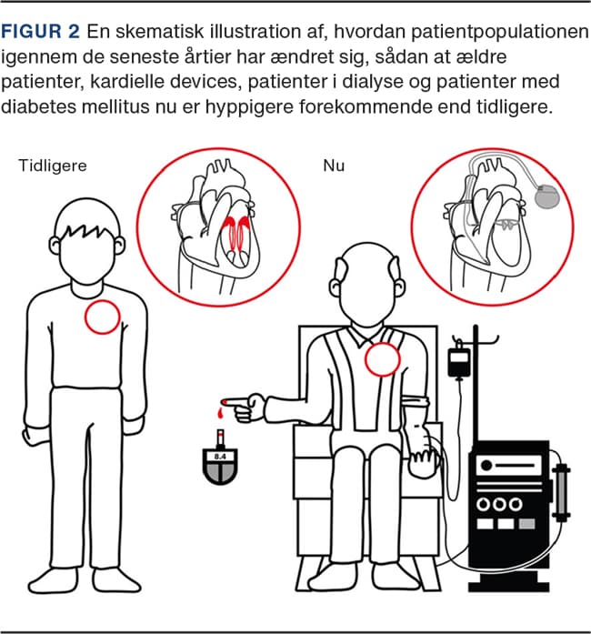 Figur 2 viser udviklingen i de almindeligste patientkarakteristika hen over tid. I den præantibiotiske æra var den typiske præsentation af en patient med IE en relativt ung mand med reumatisk hjertesygdom [3, 14]. Flere risikofaktorer for IE er blevet mere prævalente i baggrundsbefolkningen og kan være en mulig forklaring på den stigende incidens af IE. Befolkningen er generelt blevet ældre, og på tværs af landegrænser har alder vist sig at være en betydende risikofaktor for IE. Yderligere får et større antal patienter implanteret pace device eller hjerteklapprotese end tidligere. Dertil er incidensen af patienter i dialyse stigende både i Europa og USA med en årlig stigning på omkring 2%. Anlæggelse af katetre og gennemførelse af dialyse giver risiko for peritonitis og bakteriæmi og dermed for udvikling af IE [15, 16]. Personer med et intravenøst (i.v.) stofmisbrug udgør en relativt lille andel af alle patienter med IE i Danmark (< 5%) [17]. Dette er betydeligt højere i USA, hvor personer med i.v.-stofmisbrug udgør 10-15% af patienter med IE [4].