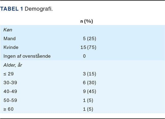 I alt 20 personer deltog i forsøget fordelt i faggrupper på seks læger, 11 sygeplejersker og tre sekretærer. Der var 24 frafald: Spiser ikke svinekød (n = 6), beskæftiget med andre arbejdsopgaver (n = 13), andre årsager (n = 5). Medianaldersgruppen var 40-49 år, og 75% af deltagerne var kvinder. Testpanelets demografiske data fremgår af Tabel 1.