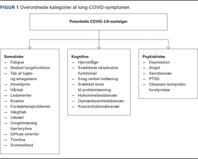 Sundhedsstyrelsen definerer COVID-19-senfølger som helbredsproblemer opstået under eller umiddelbart efter infektion med ny coronavirus, eller som er relateret til behandlingen heraf, og som er vedvarende i ≥ 12 uger i forlængelse af den akutte sygdom [4]. WHO har publiceret en enslydende definition, hvori kognitive vanskeligheder fremhæves som et hyppigt symptom [5]. Man har observeret mere end 50 long-COVID-symptomer, der kategoriseres som enten somatiske, kognitive eller neuropsykiatriske (Figur 1) [6]. Om end de mest syge patienter med COVID-19 ofte vil udvikle flest senfølger, findes der endnu ingen biomarkører, hvormed senfølgerne kan forudsiges eller diagnosticeres. For at undersøge og behandle patienter med senfølger har man på globalt plan etableret tværfaglige COVID-19-senfølgeklinikker, herunder også i de danske regioner.