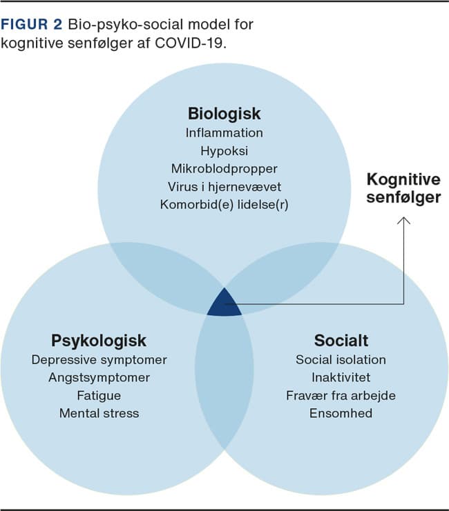 Kognitive vanskeligheder efter COVID-19 kan udspringe og forværres af bl.a. mental stress, ensomhed, fysisk og mental inaktivitet og selve det at være indlagt ved svært sygdomsforløb. I en kognitiv testundersøgelse af > 300 personer har man f.eks. fundet, at social isolation under pandemien havde negativ indvirkning på kognitive evner [29]. De kognitive senfølger kan også forværres af neuropsykiatriske senfølger. En undersøgelse af sundhedsdata fra > 230.000 amerikanske patienter med COVID-19 viste, at 34% opfyldte kriterierne for en neurologisk eller psykiatrisk lidelse inden for seks måneder efter infektionen (heraf 13% med sygdomsdebut), hyppigst depression og angst [30]. Psykiatriske symptomer og potentielle kognitive senfølger påvirker derfor sandsynligvis hinanden og kan danne en ond cirkel [14]. Kognitive vanskeligheder kan spænde ben for, at patienterne kan fungere til daglig, og dermed føre til stress, angst og depressionssymptomer. Samtidig kan angst og depression i sig selv være forbundet med nedsat evne til at huske og koncentrere sig [14]. Det er derfor vigtigt at afdække patientens psykiske tilstand ud over de kognitive funktioner for at afklare relevante behandlingstiltag.