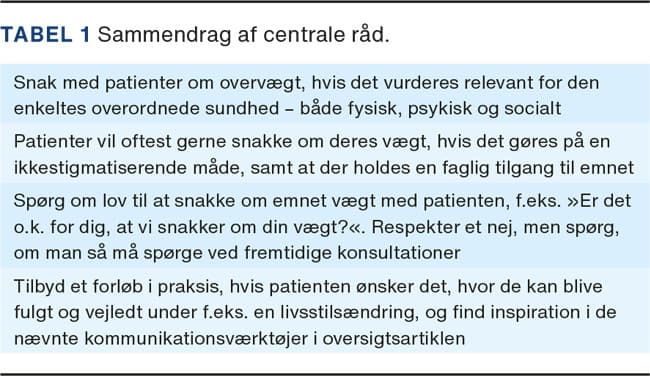 Formålet med denne artikel er at give overblik over den eksisterende viden om praktiserende lægers kommunikation om vægtrelaterede problemer med patienter med svær overvægt samt udfordringer hermed. Artiklen giver også indsigt i forskellige kommunikationsværktøjer, som kan lette og fremme kommunikationen om vægt og vægtrelaterede emner.