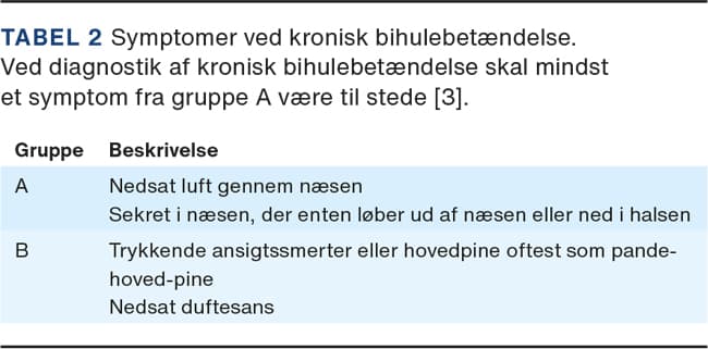 Diagnosen kronisk CRS kræver vedvarende symptomer gennem ≥ 12 uger, samt to eller flere af symptomerne foreslået i European Position Paper on Rhinosinusitis and Nasal Polyps 2020 (EPOS2020) (Tabel 2) [6]. Patienter med CRS har kronisk sygelighed og højt sygefravær. Patienterne skal have foretaget klinisk undersøgelse med nasal endoskopi. Klassisk CRS er en bilateral sygdom. Ved ensidige symptomer skal fokal patologi som f.eks. skæv næseskillevæg, tandfokus og benign eller malign tumor overvejes. CRSwNP er i den vestlige verden endotypisk domineret af type 2-inflammation med eosinofili [7] modsat CRSwNP i Asien, der er karakteriseret ved neutrofil dominans (non-type 2-inflammation), som også ses ved CRSsNP, cystisk fibrose og primær ciliedyskinesi.