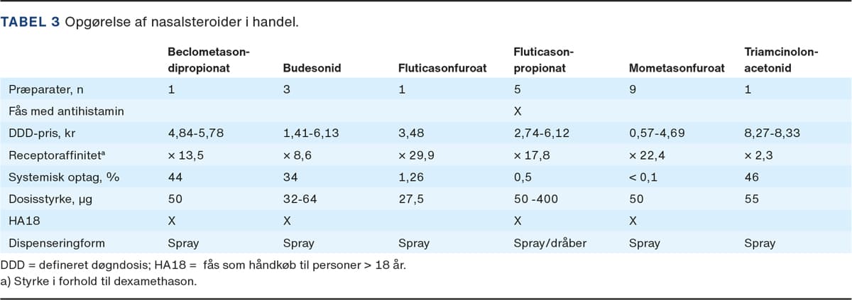 Grundpillen i den medicinske antiinflammatoriske behandling ved CRS er nasale steroider. Ved mild sygdom kan de tages én gang dagligt, ellers er der behov for to gange dagligt. Yderligere gange har ikke vist øget effekt, men dette er afhængigt af præparatvalg. Korrekt administration er altafgørende. Ved nedsat lugtesans kan man med fordel bruge steroidholdige næsedråber [6]. Nasalsteroid har få bivirkninger. Effekten indtræder efter 2-4 uger. Ved valg af præparat skal der tages hensyn til pris, doseringsform og eventuel allergi (Tabel 3).