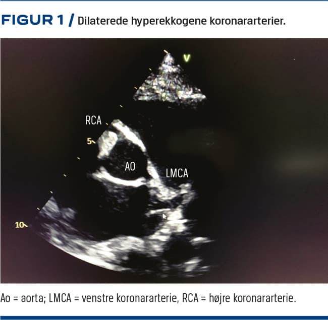 Niveauerne af hæmoglobin, leukocytter og trombocytter lå lavt i normalområdet. Niveauet af C-reaktivt protein var 77 mg/l, sænkningsreaktionen 59 mm/t og ferritinniveauet 670 µg/l. Der var forhøjede myokardiemarkører med troponin T (TNT)-niveau 49 ng/l og pro-brain natriuretisk peptid (ProBNP)-niveau 3.120 ng/l. En ekkokardiografi (EKKO) viste dilatation af koronarkar (højre 3,5 mm, Z-score +2,56, venstre 3,9 mm, Z-score +2,92), ingen aneurismer og normal pumpefunktion (Figur 1). Elektrokardiogrammet viste uspecifikke ST/T-tak-forandringer i midterste prækordialafledninger og ascenderende ST-depressioner i laterale og inferiore afledninger. Kriterierne for KS var opfyldt, og drengen blev sat i intravenøs behandling med immunoglobulin (Ig) og acetylsalicylsyre.