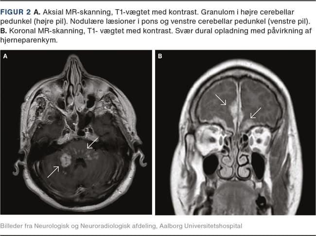 Diffus inflammation og noduli i leptomeninges er en hyppigt set tilstand og viser sig klinisk som subakut lymfocytær meningitis med hovedpine og rammer især de basale meninges [4-6], men kan være placeret over konveksiteterne. Komplikationer er ventrikulitis, hydrocefalus, evt. med livstruende forhøjet intrakranielt tryk (Figur 1A) eller kranienerveudfald.