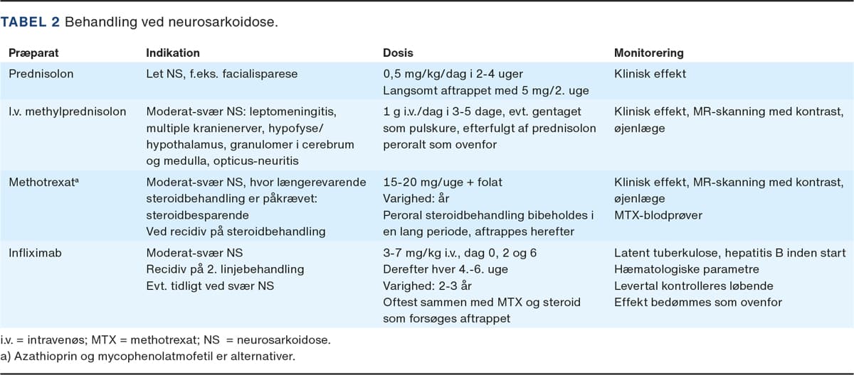 Behandling af NS er en udfordring pga. den diagnostiske usikkerhed, sygdommens alvor samt mangel på placebokontrollerede studier og bør kun varetages af få højtspecialiserede afdelinger. I modsætning til lungesarkoidose kræver NS altid immunsuppressiv behandling, da symptomerne er potentielt invaliderende. Behandlingen er individuel og afhænger af symptomernes sværhedsgrad (Tabel 2). Der er konsensus om, at steroid er førstevalg [4-6, 8-10, 23] enten peroralt givet i lette tilfælde eller som intravenøst givet methylprednisolon i moderate til svære tilfælde, evt. som pulskure. Steroidbehandling skal aftrappes meget langsomt for at undgå recidiv og bibeholdes i lang tid også efter tillæg af anden- og tredjelinjebehandling [24-26, 27]. Det er ikke ualmindeligt, at steroid ikke kan trappes helt ud. Andenlinjeimmunsuppresiv behandling skal overvejes tidligt i forløbet. Steroidbesparende præparater som methotrexat (MTX), azathioprin eller mycophenolatmofetil (MMT) kan benyttes. MTX er mest anvendt [6, 8, 9, 27] og har en lavere recidivrate: MTX 47%, MMT 79% [27]. Uanset valg af præparat skal den steroidbesparende behandling bibeholdes i 2-3 år, i nogle tilfælde længere [6, 9, 10]. Ved recidiv på andenlinjebehandling har cyclophosphamid været anvendt [9]. I disse tilfælde er TNF-alfablokkeren infliximab en ny behandlingsmulighed og anbefales nu også tidligt ved svær NS [26, 28]. Effekten er påvist i tre relativt store retrospektive studier [25, 26, 29], oftest i kombination med MTX eller MMT. Bedring på MR-skanning sås hos 71-82% [26, 29] og klinisk respons hos 70-89% [24, 28]. Recidivraten var dog høj: 50-56% i to studier ved en medianbehandlingstid på 18-20 mdr. [24, 25], hvilket taler for en længere behandlingstid på 3-4 år [26, 28]. Det anslås, at ca. 20% har behov for tredjelinjebehandling med infliximab [26]. Perifer neuropati ved NS responderer dårligt på behandling. Intravenøst givet immunglobulin og infliximab kan forsøges [29].