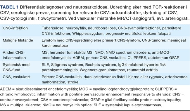 CNS-infektioner, herunder systemiske infektioner, som spredes til CNS, andre inflammatoriske tilstande i CNS og malignitet skal overvejes (Tabel 1). De fleste kan udelukkes ved relevant udredning. Facialisparese ved NS kan ikke skelnes fra langt hyppigere årsager som idiopatisk perifer facialisparese eller neuroborreliose. Overvejelser om NS bør ske, hvis paresen er recidiverende eller dobbeltsidig. Subakut opticusneuritis ved NS ligner klinisk den, der ses ved MS eller neuromyelitis optica (NMO). Multiple kranienerveudfald ved svær basal leptomenigitis kan også ses ved tuberkulose, neurosyfilis, meningeal karcinomatose eller diffus lymfocytær meningitis.