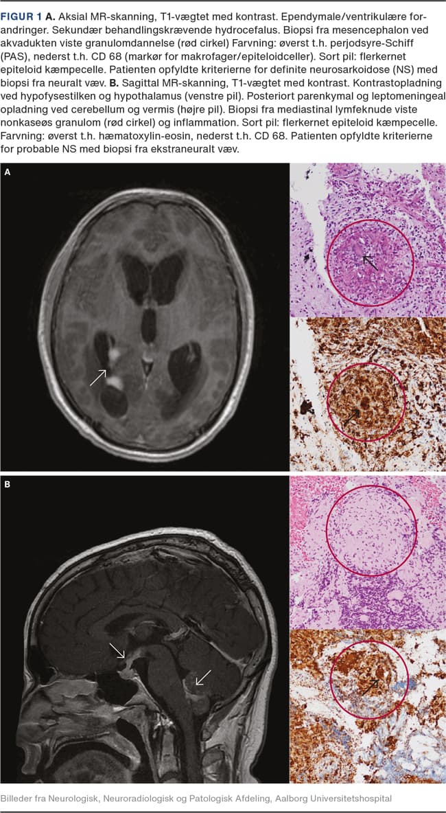 Sarkoid inflammation og granulomer i hjernen kan give en række neurologiske problemer afhængigt af udviklingshastighed, lokalisation og omfanget af den inflammatoriske proces. Ved NS ses der ofte påvirkning af hypofysen og hypothalamus [7, 9-11] (Figur 1B), hvilket kan give neuroendokrine forstyrrelser som hypofyseinsufficens og chiasmainvolvering med synsudfald eller hypotalamiske symptomer med træthed, tørst, apati og ændret temperaturregulering. NS i andre dele af hjernen kan bl.a. give epileptiske anfald, hemiparese, afasi eller ataksi afhængigt af inflammationens placering [5, 7, 9]. Spredte periventrikulære og subkortikale white matter lesions (WM-læsioner), som giver mere diffuse symptomer, ses. Vaskulære forandringer, som er udløst af vaskulitis, eller inflammatorisk tryk på arterier eller hjernens drænvener, kan give et strokelignende billede [12].