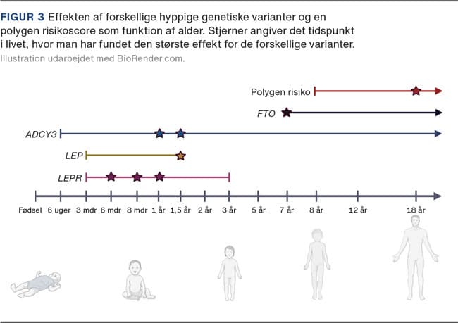Hvor stærkt den genetiske risikoscore associerer med vægt, har vist sig at være afhængigt af alder, idet der ved fødslen er en beskeden forskel i vægt imellem dem med den højeste og laveste risikoscore, mens forskellen stiger til 3,5 kg i otteårsalderen og 12,3 kg i 18-årsalderen [23] (Figur 3). Kigger man på effekten af enkelte hyppigt forekommende varianter i LEPR, ADCY3 og FTO, ser man ligeledes en aldersafhængig effekt fra fødslen og op igennem barndommen [24] (Figur 3). Slutteligt har en større metaanalyse vist, at arveligheden af BMI er større i barn- og ungdommen i forhold til voksenlivet [25]. Samlet indikerer disse fund, at de genetiske varianter har et tidsvindue for den største effekt og dermed ikke har en konstant effekt på kropsvægten igennem livet.