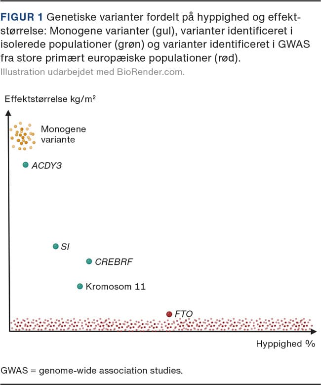 GWAS har primært været udført med europæere, hvor man har identificeret mere end 900 genetiske varianter, der associerer med BMI [9]. Størstedelen af disse varianter er hyppige og har en lav effektstørrelse, og den største rapporterede effekt er på 0,35 kg/m2 pr. risikoallel for varianter i FTO [6, 9] (Figur 1).