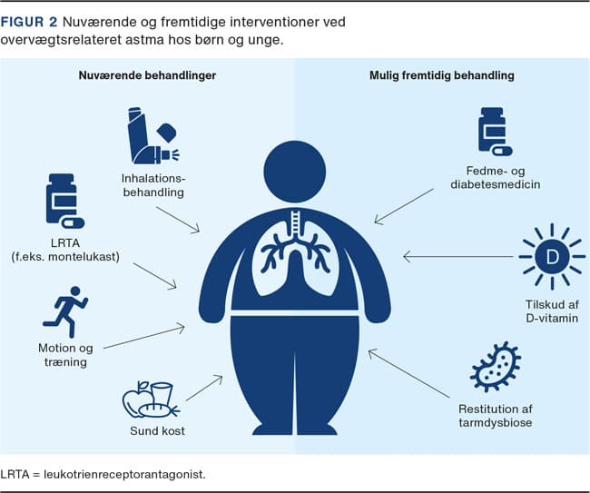 Mulige fremtidige interventioner til overvægtsrelateret astma hos børn og unge kunne være tilskud af D-vitamin [29] og restitution af tarmdysbiose, som ses ved både svær overvægt og astma [30] (Figur 2). Flere studier har vist, at både astma og svær overvægt er kroniske betændelsestilstande, der begge er associeret til lavt D-vitamin, som er et fedtopløseligt vitamin, der bl.a. har antiinflammatoriske egenskaber. D-vitamintilskud har derfor et teoretisk potentiale til at mindske den kroniske betændelsestilstand ved overvægtsrelateret astma, men det er vigtigt at fastslå, at der på nuværende tidspunkt ikke er evidens for, at D-vitamintilskud øger astmakontrol eller reducerer forekomsten af eksacerbationer hos børn og unge.