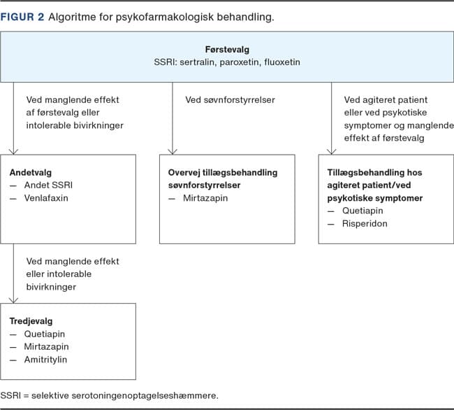 På baggrund af den foreliggende evidens anbefales følgende farmakologiske præparater til behandling af PTSD: sertralin, paroxetin, fluoxetin, venlafaxin og quetiapin [16, 17, 19]. Sertralin og paroxetin er markedsført i Danmark til behandlingsindikationen PTSD. De øvrige præparater vil i behandling af PTSD være off-label. PTSD har ofte et fluktuerende forløb, hvor der ses tilbagefald og kroniske forløb. Der er derfor ofte behov for langvarig farmakologisk behandling af en varighed på mere end 12 måneder [19]. Suboptimal dosis eller suboptimal varighed af behandlingen er hyppig og vil medføre manglende effekt af behandlingen [19, 20]. Mange patienter responderer kun delvist eller slet ikke på førstevalgspræparatet. På den baggrund er der behov for en trinvis tilgang til den farmakologiske behandling. I det følgende præsenteres en algoritme for evidensbaseret farmakologisk behandling baseret på ISTSS og NICE [14, 17, 19, 21] (Figur 2).