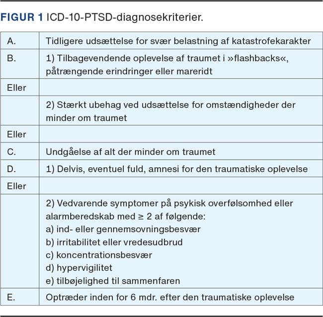 PTSD betegnes som en protraheret reaktion på en traumatisk begivenhed af exceptionelt truende karakter (Figur 1), og diagnosen bygger i sin kerne på frygtreaktion. Diagnosen er beskrevet i både det europæiske diagnosesystem ICD-10 og det amerikanske diagnosesystem DSM-5 [3, 4].