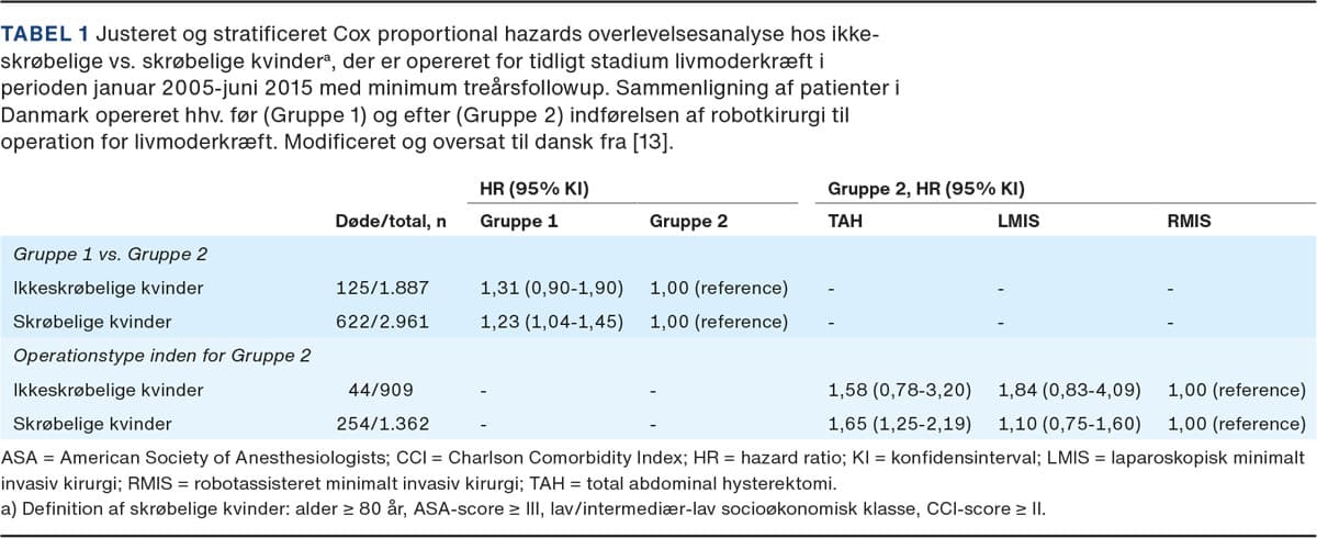 En dansk forskergruppe har kortlagt associationen mellem alvorlige komplikationer, overlevelse, omkostninger og den nationale indførelse af RAK for EC. Indførelsen af RAK var associeret med en signifikant nedsat risiko for alvorlige komplikationer [12] og signifikant forbedring af overlevelsen [13]. I en ad hoc-analyse (Tabel 1) fandt man, at overlevelsesgevinsten primært sås hos de to tredjedele af patienterne, som blev defineret som skrøbelige. Yderligere undersøgte gruppen de langsigtede ressourcemæssige konsekvenser og meromkostninger, bl.a. baseret på de danske takstafregningssystemer DRG og DAGS for hhv. behandling på sygehus og ambulant aktivitet [9, 14]. Konklusionen var, at den nationale indførelse af RAK medførte meromkostninger for normalvægtige, men ikke for adipøse kvinder. Sidstnævnte synes især drevet af en signifikant reduktion i antal indlæggelsesdage relateret til selve operationen samt en reduktion i indlæggelser efter operationen.
