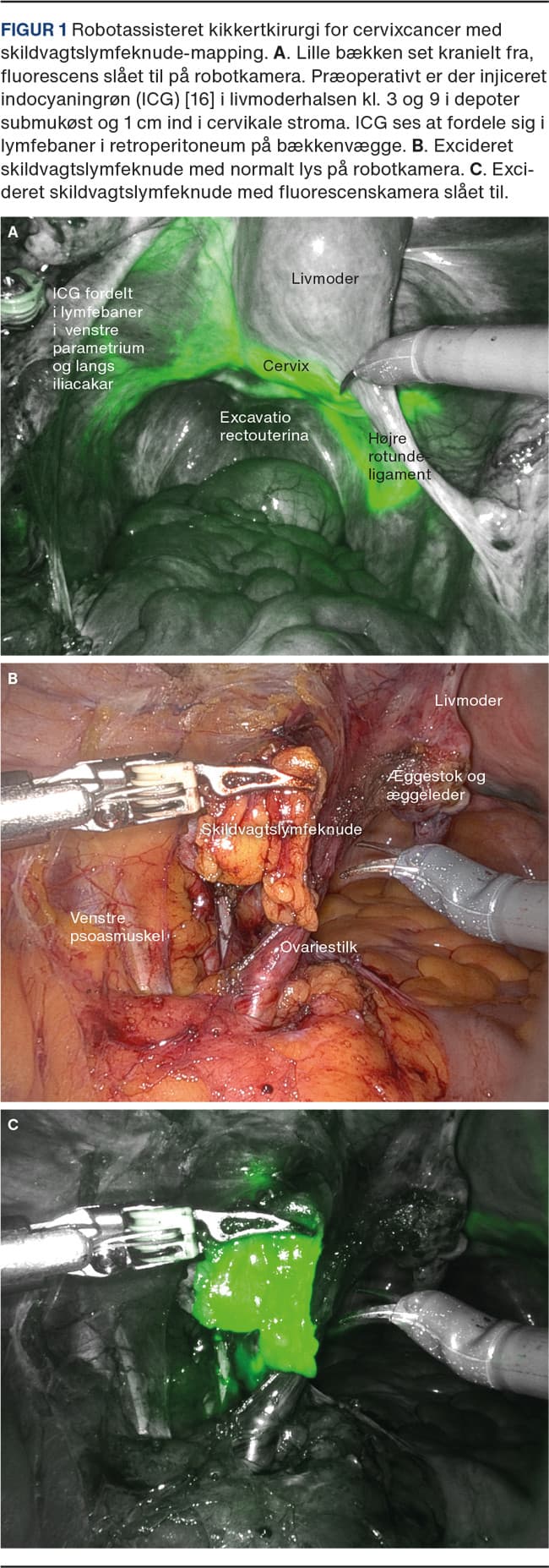 Operation for cervixcancer (CC) er i dag centraliseret på tre centre i Danmark og udføres af få certificerede kirurger. RAK for CC i tidligt stadium indførtes nationalt i årene 2008-2012 med en stejl adaptationskurve pr. center fra åben adgang til RAK [15]. Ved cervikal injektion af ICG som sporstof kan man, med robotkameraets fluorescensfunktion, følge lymfebaner og foretage mapping af de såkaldte skildvagtslymfeknuder (Figur 1). Et nationalt dansk studie har bidraget til implementering af teknikken, idet der er påvist øget chance for identifikation af mikrometastaser ved patologisk ultrastaging af skildvagtslymfeknuder og dermed mere korrekt allokering til adjuverende behandling [1, 15]. Hos kvinder med fertilitetsønske kan man ved små tumorer tilbyde fertilitetsbevarende operation. Årligt får 8-10 patienter tilbudt trakelektomi ved RAK, som er centraliseret på Rigshospitalet [17].