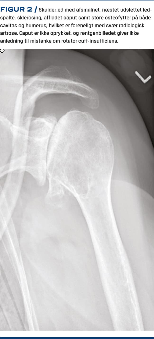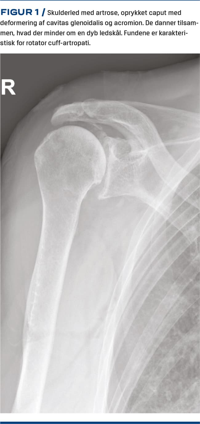 Skulderartrose ses både primært og sekundært i forbindelse med fraktur, ustabilitet eller slid i rotator cuff-senerne. Ved samtidig artrose og rotator cuff-destruktion benævnes tilstanden rotator cuff-artropati (Figur 1). Prævalensen af artrose i skulderleddet er ca. 20% efter 80-årsalderen [1]. Patienter, der opereres med en skulderalloplastik, monitoreres af Dansk Skulderalloplastik Register (DSR) [2]. Her er der påvist en stigning i antallet af alloplastikker, som er indsat pga. artrose eller rotator cuff-artropati, fra 356 i 2008 til 836 i 2019. Årsagen til stigningen er ukendt, men kan skyldes en stigende forekomst af svære tilfælde, bedre behandlingsmuligheder, bedre kendskab til disse eller indikationsskred.
