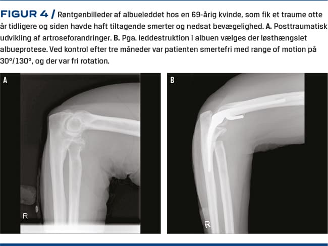 Artrose i albuen kan behandles med artroskopisk eller åben led-løsning med synovektomi, løsning af kapsel og resektion af osseøse prominenser herunder caput radii og ledmus. Herved kan bevægelighed, smerter og aflåsninger bedres. I degenerative led er bedringen oftest forbigående, men kan udskyde tidspunktet for alloplastik. Prognosen ved isolerede bløddelskontrakturer er betydeligt bedre. Ved fremskredne tilfælde med symptomer fra n. ulnaris giver åben kirurgi mulighed for samtidig in situ-løsning af n. ulnaris. Ellers er resultaterne for åben og skopisk operation sammenlignelige [6, 26]. Efterbehandlingen er hurtig guidet mobilisering evt. med passiv udstrækning [6, 26]. Ved svær artrose, hvor andre behandlingstilbud har fejlet, kan albuealloplastik tilbydes [6, 8, 27]. Der findes forskellige alloplastiktyper, der anvendes på forskellige indikationer [8, 27]. Den løst hængslede totalalloplastik er den mest anvendte og fremviser de bedste resultater ved artrose (Figur 4) [7, 27, 28]. Efterbehandling er oftest kort immobilisering i bandage, efterfulgt af fri guidet mobilisering. 90% oplever lindring af smerterne, men må acceptere vægtrestriktion for ekstremiteten. Tiårsproteseoverlevelsen er i europæiske studier 80-85% [8, 27, 28]. Proteseløsning, fraktur, dyb infektion og n. ulnaris-påvirkning er de hyppigste komplikationer, der ses i op til 20% af tilfældene [8, 29, 30].