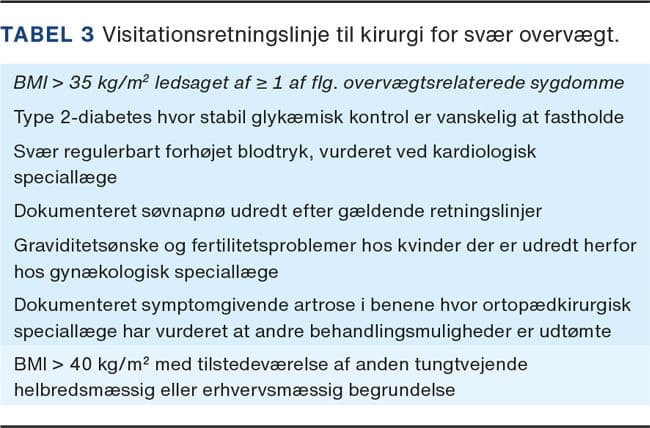 Overvægtskirurgi er fortsat den mest effektive vægttabsbehandling, men er forbeholdt patienter, som har svær overvægt (BMI > 35 kg/m2) og følgesygdomme, og som ikke kan opnå vægttab gennem livsstilsændringer, kostomlægninger og medicin. Vurdering mhp. overvægtskirurgi på et offentligt hospital kræver opfyldelse af Sundhedsstyrelsens visitationskriterier (Tabel 3). Man bør være opmærksom på, at kriterierne for at kunne blive tilbudt kirurgi for svær overvægt er forskellige i privat og offentligt regi. Således vil alle med BMI ≥ 40 kg/m2 i princippet kunne opnå kirurgi for svær overvægt hos en privat udbyder, hvis et indgreb ikke er kontraindiceret. I offentligt regi vil det kræve, at der foreligger en væsentlig sundhedsfaglig begrundelse herfor. Vægttabene efter kirurgi er betragtelige og udgør i gennemsnit ca. 30% af kropsvægten efter et år, og vægttabet fastholdes i en lang periode derefter hos hovedparten af patienterne [10].